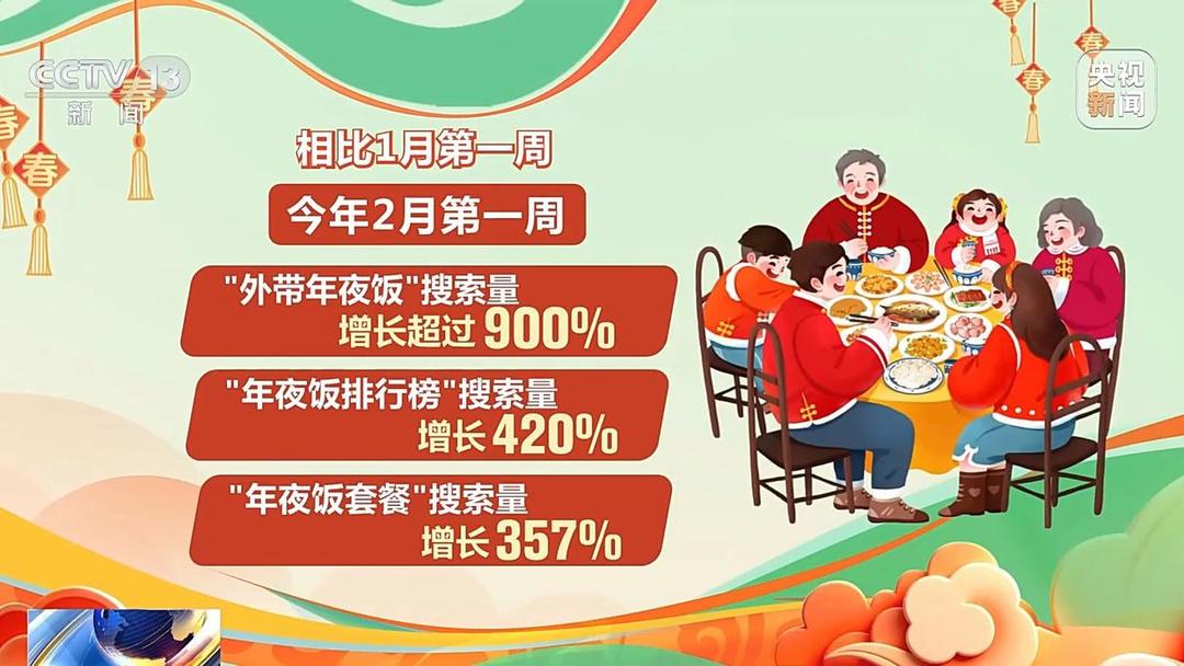 数据显示,相比1月第一周,今年2月第一周“外带年夜饭”搜索量增长超过900%,“年夜饭排行榜”搜索量增长420%,“年夜饭套餐”搜索量增长357%。