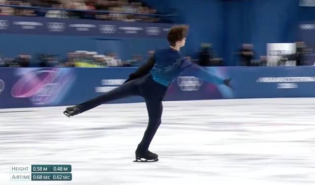 本届奥运会花滑比赛直观地呈现了起跳高度和滞空时间(左下角)