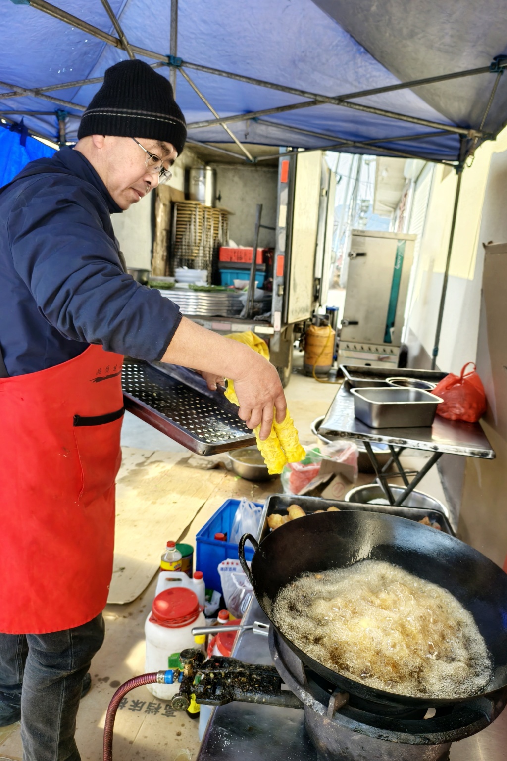 早上7点半,货车驶进雇主家门前的空场。 在小院内支棚、架灶、摆桌、码凳,两人配合得像钟表齿轮;在小院外王卫州搬下自制的灶台,孙秀英麻利支起案桌。当天的任务是4桌乔迁宴——鸡要炖得脱骨、鱼要蒸得入味、扣肉必须肥而不腻。灶火腾起的瞬间,铁锅里的热油“滋啦”一声,葱姜蒜爆出的香气立刻在腊月的寒风里弥散开来。热菜、凉菜次第上桌,宾主尽欢。“出来给人做菜,第一是食材新鲜,第二才是厨艺。” 50岁的王卫州站在临时支起的棚子下,手里的炒勺翻飞,语气平淡,却透着23年的底气。