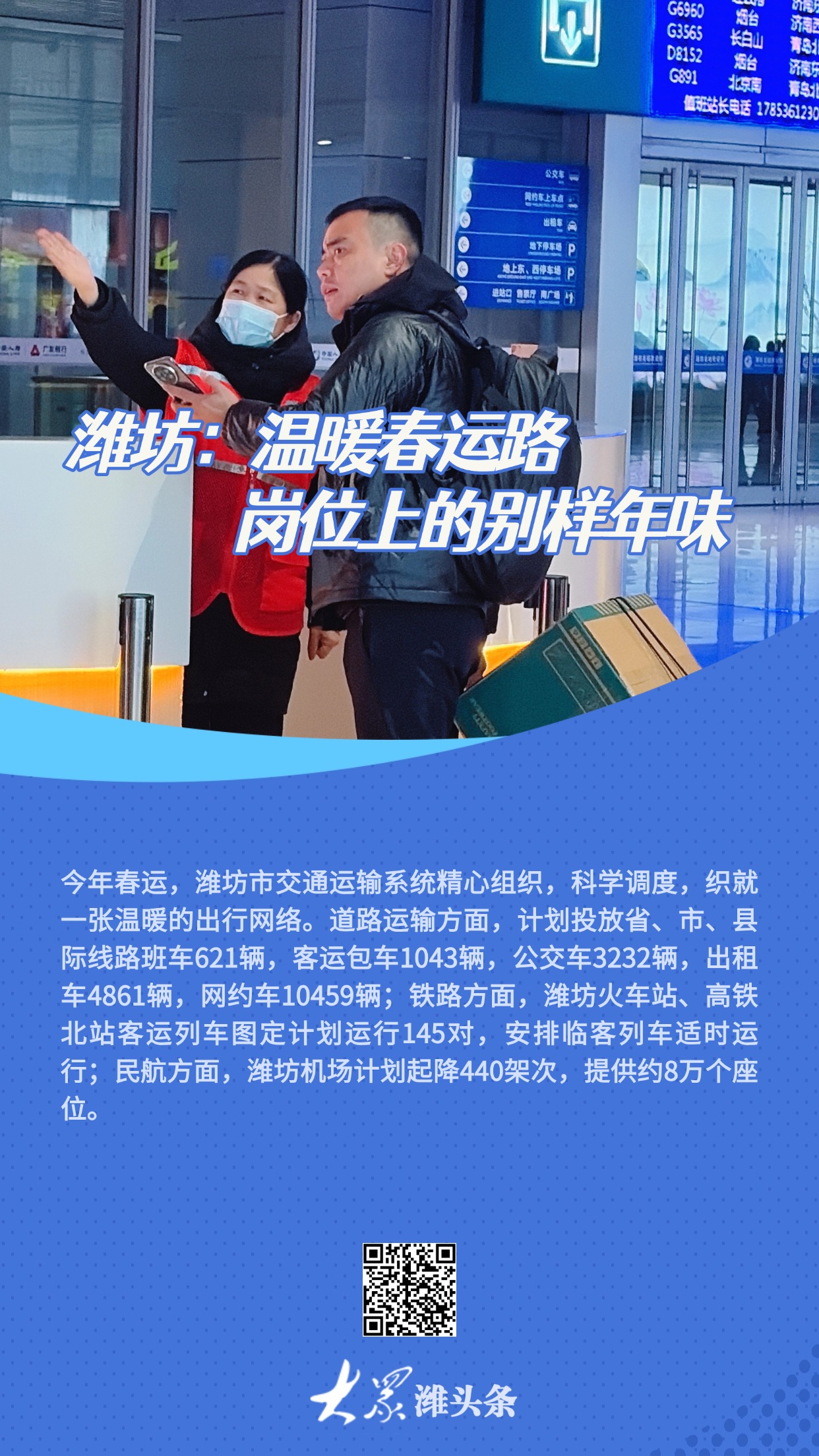 受经济回暖和春节假期延长推动,群众出行意愿强烈。今年春运,潍坊市交通运输系统精心组织,科学调度,织就一张温暖的出行网络。道路运输方面,计划投放省、市、县际线路班车621辆,客运包车1043辆,公交车3232辆,出租车4861辆,网约车10459辆;铁路方面,潍坊火车站、高铁北站客运列车图定计划运行145对,安排临客列车适时运行;民航方面,潍坊机场计划起降440架次,提供约8万个座位。