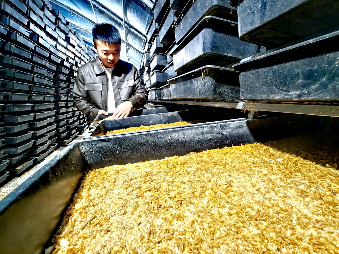 在安兴镇菏泽海祥养殖有限公司,光伏板下11个标准化大棚整齐排列,大棚内,分层养殖架上数以亿计的黄粉虫蠕动。“上面发电、下面养殖,是空间立体利用。”负责人倪丙磊时候,光伏设备投资700多万元、建设大棚400多万元,发电自用还余电上网盈利,黄粉虫养殖周期短、效益高,实现“一块地两份产出”。目前,干虫总产量近1000吨,市场价超2000万元,远销欧洲、东南亚等地。