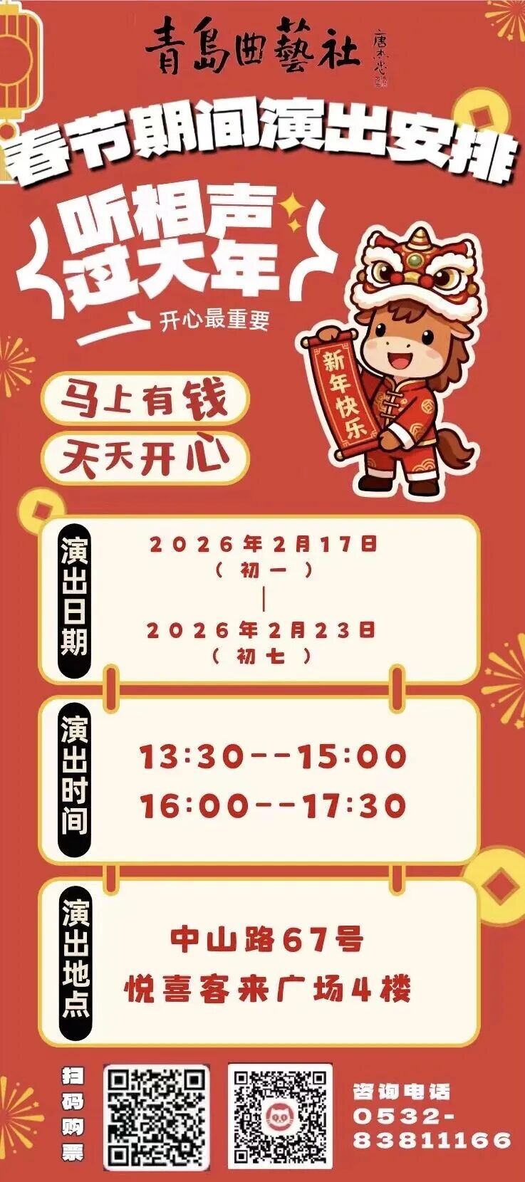 这个假期该怎么过才不辜负?走亲访友太奔波,宅家躺平太无聊,不如赴一场欢笑之约。大年初一,青岛曲艺社开箱纳福。初一至初七,每天两场不重样,这年就要乐呵着过!