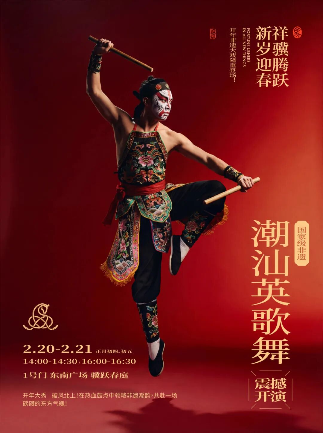 正月初四、初五,青岛万象城,潮汕英歌震天来。十五位传人踏阵北上,锣鼓撼地,舞槌生风。站舞如松,豪迈入魂,每一步都踩在心跳上。这年味顶流,看一眼就起鸡皮疙瘩。
