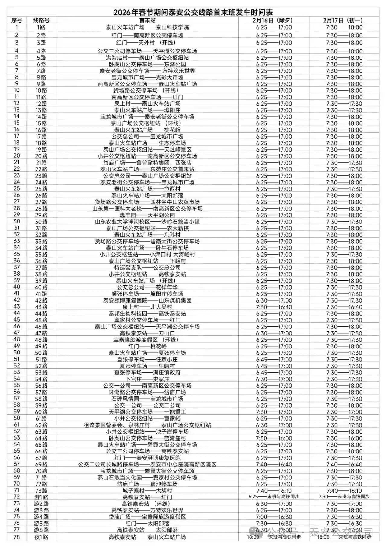 为切实保障好春节期间市民出行,泰安市公共交通有限公司根据往年春节各线路运营时间安排,并结合今年市民节日出行规律和变化,统筹考虑安排公交线路首末班发车时间,2月16日、17日(除夕、初一)将对所属营运线路发车间隔、首末班时间等作出调整(具体情况见附表)。