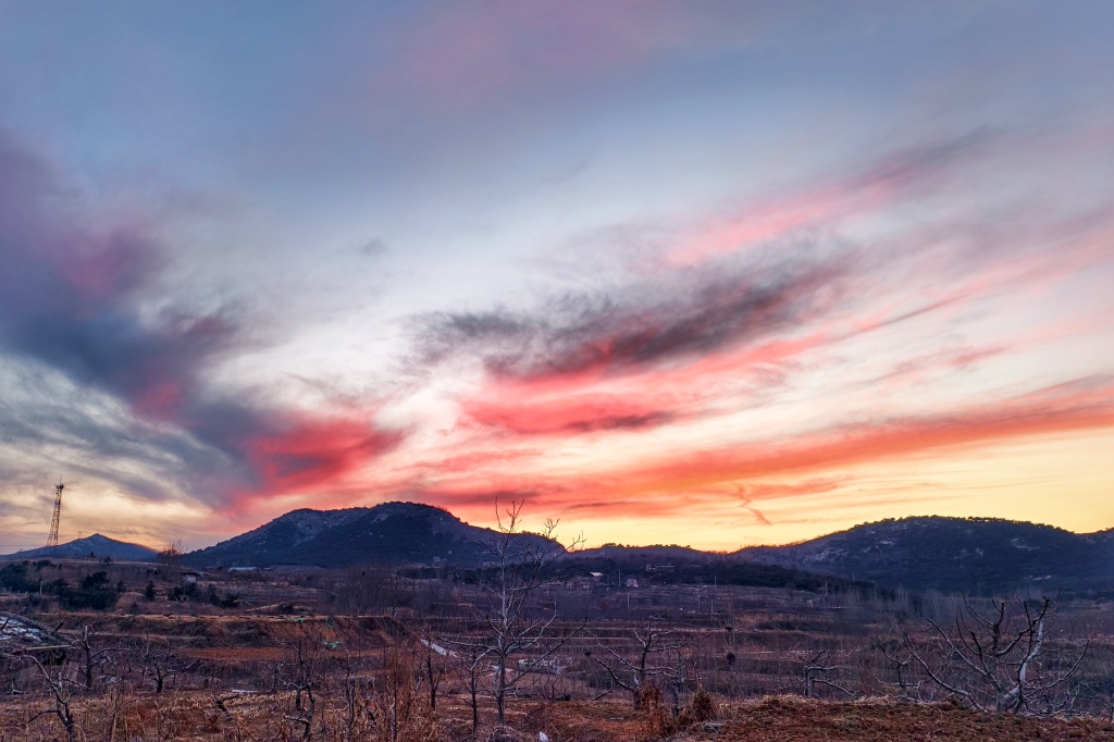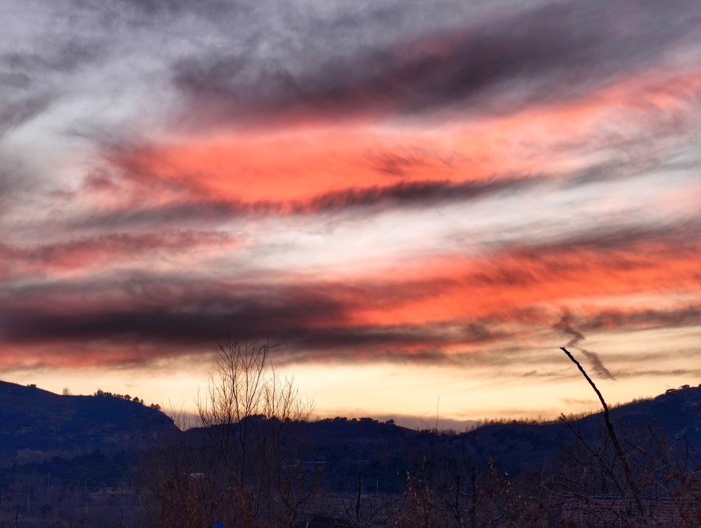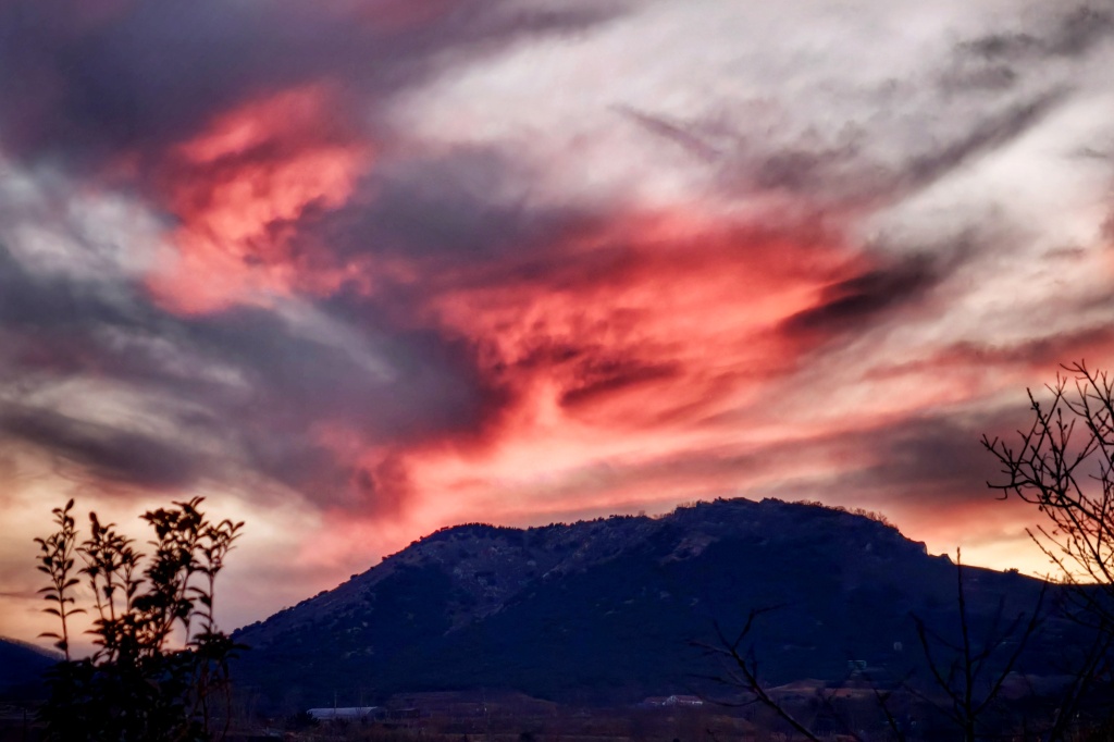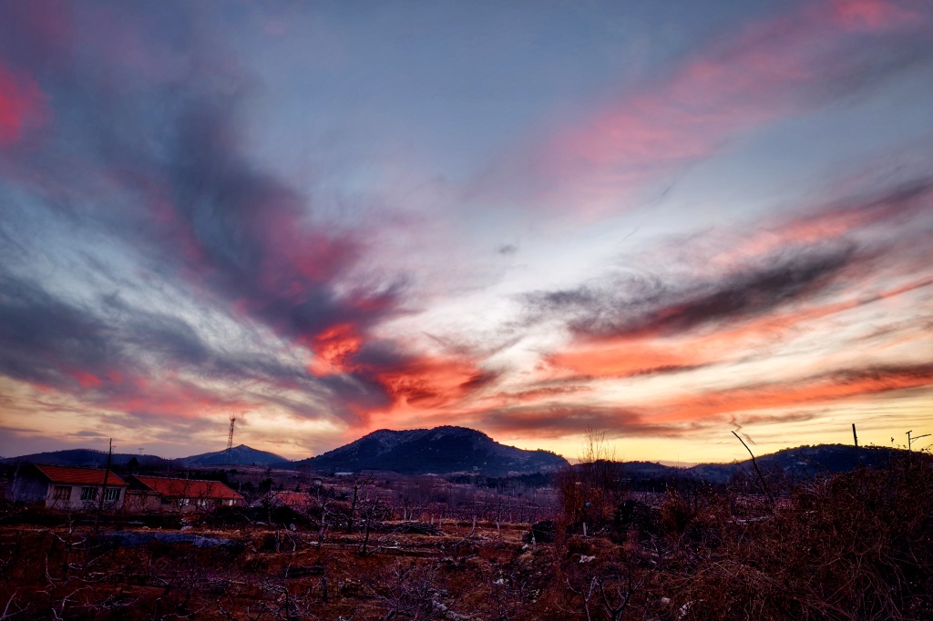2月17日,农历大年初一傍晚,青岛天空上演了一场壮丽的晚霞秀。落日西沉,没入墨色山峦,余晖将天际染成层层叠叠的赤红与暗紫,状若烈焰,如同一幅铺展在天空的巨幅油画。