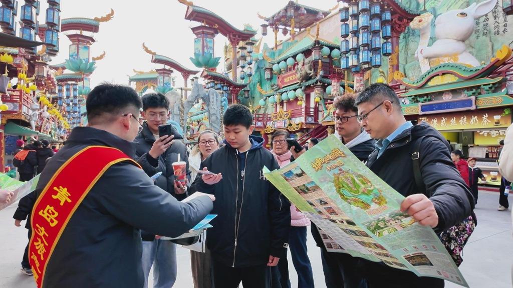 春节假期,焕新亮相的青岛山海间不夜城主题街区张灯结彩、人流如织。作为城阳区春节嘉年华的重要一站,这里处处洋溢着喜庆祥和的年味,熙熙攘攘的人群中,一场别开生面的快闪活动不期而至,文旅志愿者们穿梭其间,为游客送上新春旅行指南,传递着文明旅游理念,让新春的温暖触手可及。