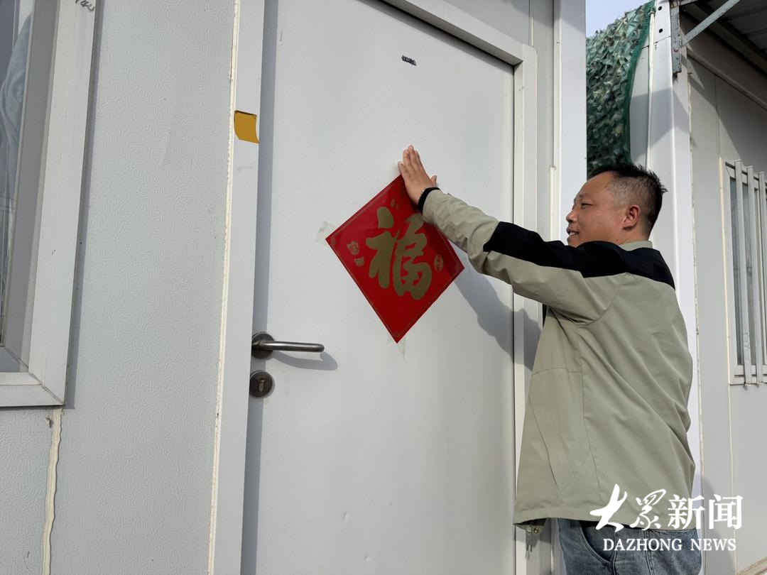 梁超正在为自己在高唐大棚边住的集装箱贴春联。