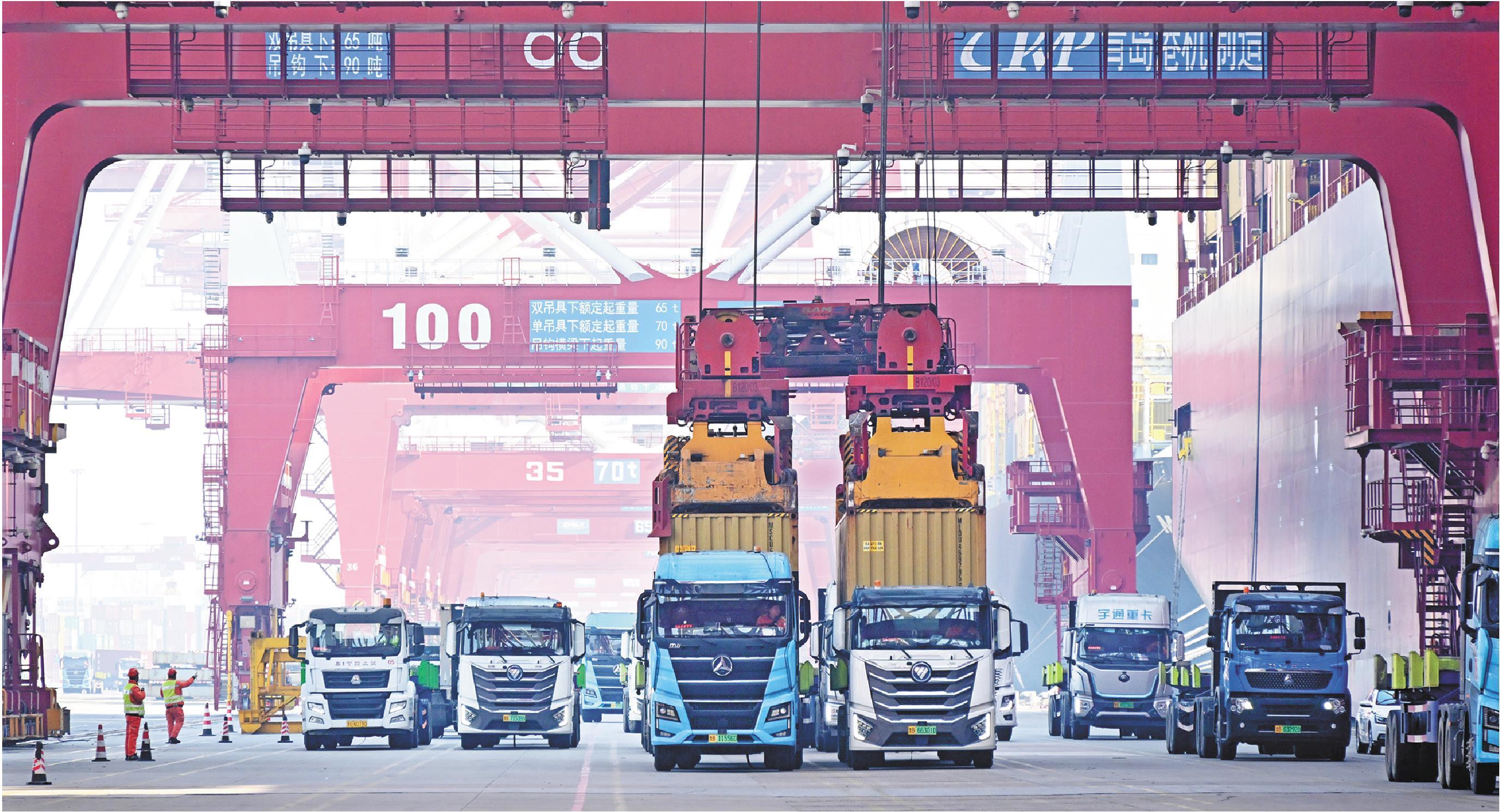 □新华社发 2月18日,卡车在青岛港前湾集装箱码头运送集装箱。