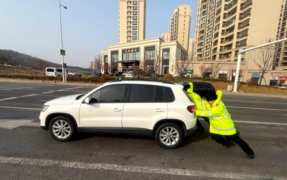 2月18日,交管支队城阳区大队警员在巡逻至安和路时,发现一辆白色SUV在信号灯变绿时停滞不前,于是立马上前查看情况。为避免发生交通隐患,影响交通秩序,执勤人员立即下车,帮助司机将车辆推到路边不妨碍交通的地方,并帮助联系救援车辆。