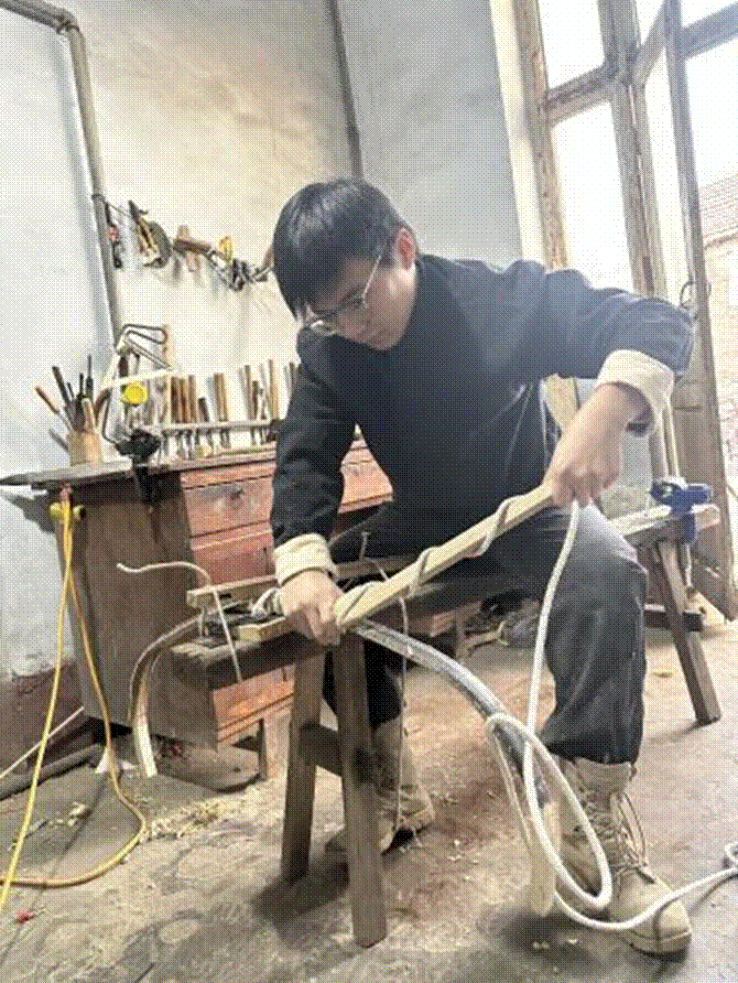 崔成栋的制弓工坊,没有固定的门面,更像一个流动的“一人车间”。有时在学校闲置的角落,更多时候是在老家一个堆满木料和半成品的小院里。工具摊开,便是一个世界。