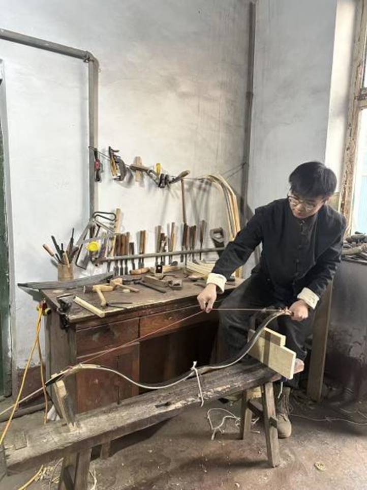 在工作室里,常能看到这样的画面:崔成栋将弓胎与牛角片并合,用麻绳紧紧绑缚,随后将弓身卡入传统工具“压马”的凹槽中。他左膝轻抵以稳定弓身,右手牵引麻绳,从弓腹至弓梢,一圈接一圈,缠绕得均匀而紧密。他布满细微划痕的双手稳定有力,动作如呼吸般流畅自然。这双属于“00后”的手,此刻承载的却是流传千年的工艺记忆。