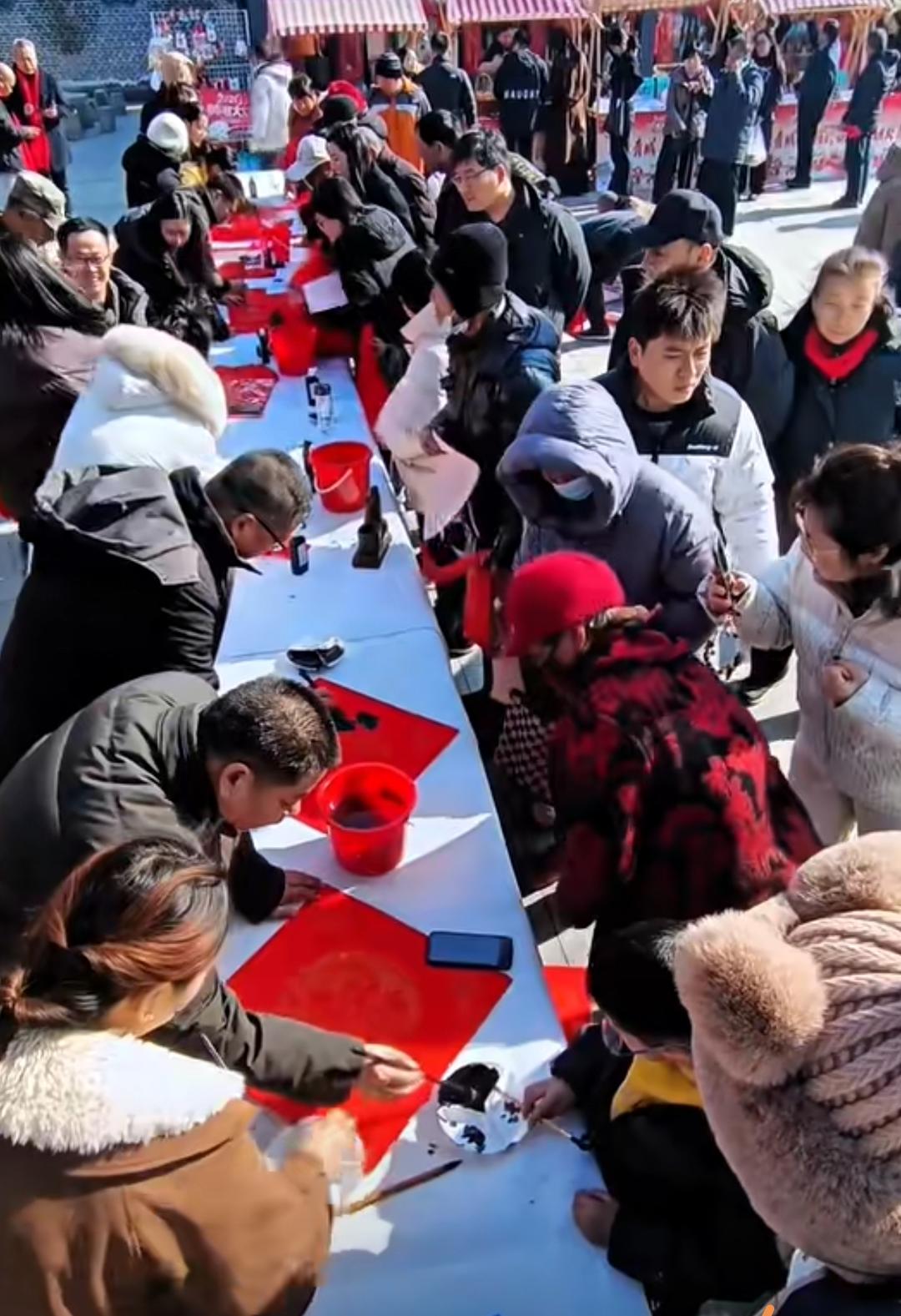 红纸铺展,毛笔起落,墨香在人群中流淌,围观的乡邻凑着热闹,有人念叨着想要的联语,有人接过刚写好的春联小心晾干,欢声笑语里,是传统文化最动人的传承。