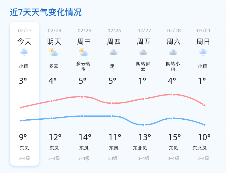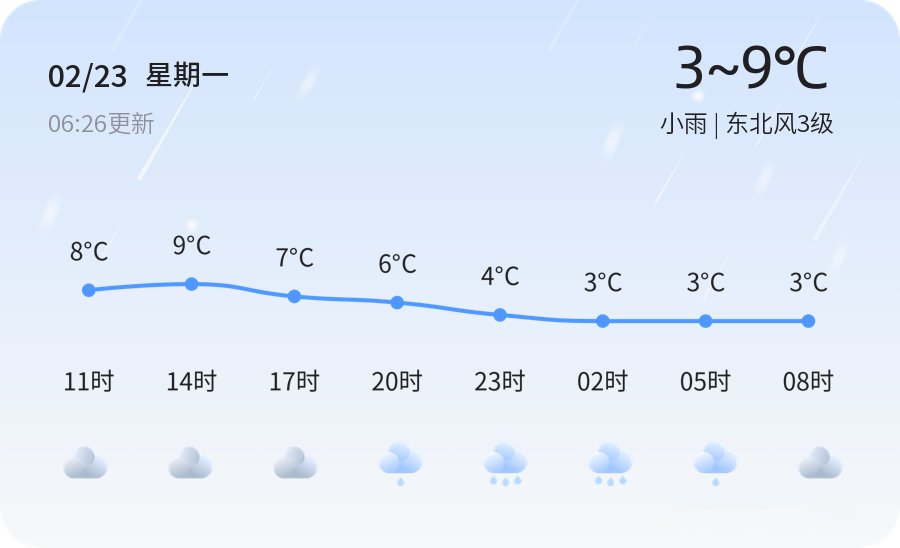 今天是2026年2月23日,农历正月初七,星期一。临沂市今日天气以小雨为主,气温介于3℃至9℃之间,东北风3级,空气湿度46%,PM2.5指数为25。各区县天气情况一致,均以小雨为主,市民出行需注意携带雨具并做好防寒保暖措施。