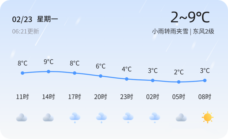 今天是2月23日,星期一,农历正月初七。济宁市今日天气为小雨转雨夹雪,气温在2℃至9℃之间,东风2级,空气湿度40%,空气质量良好。受雨雪天气影响,路面可能湿滑,市民出行请注意交通安全,建议携带雨具,减速慢行。气温较低,市民需做好保暖措施,避免感冒。