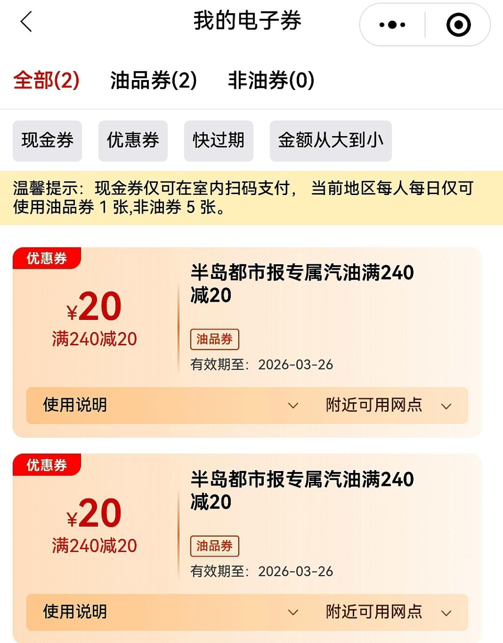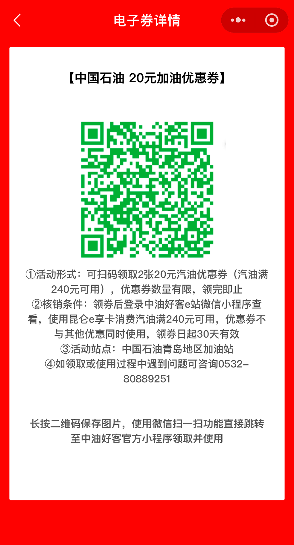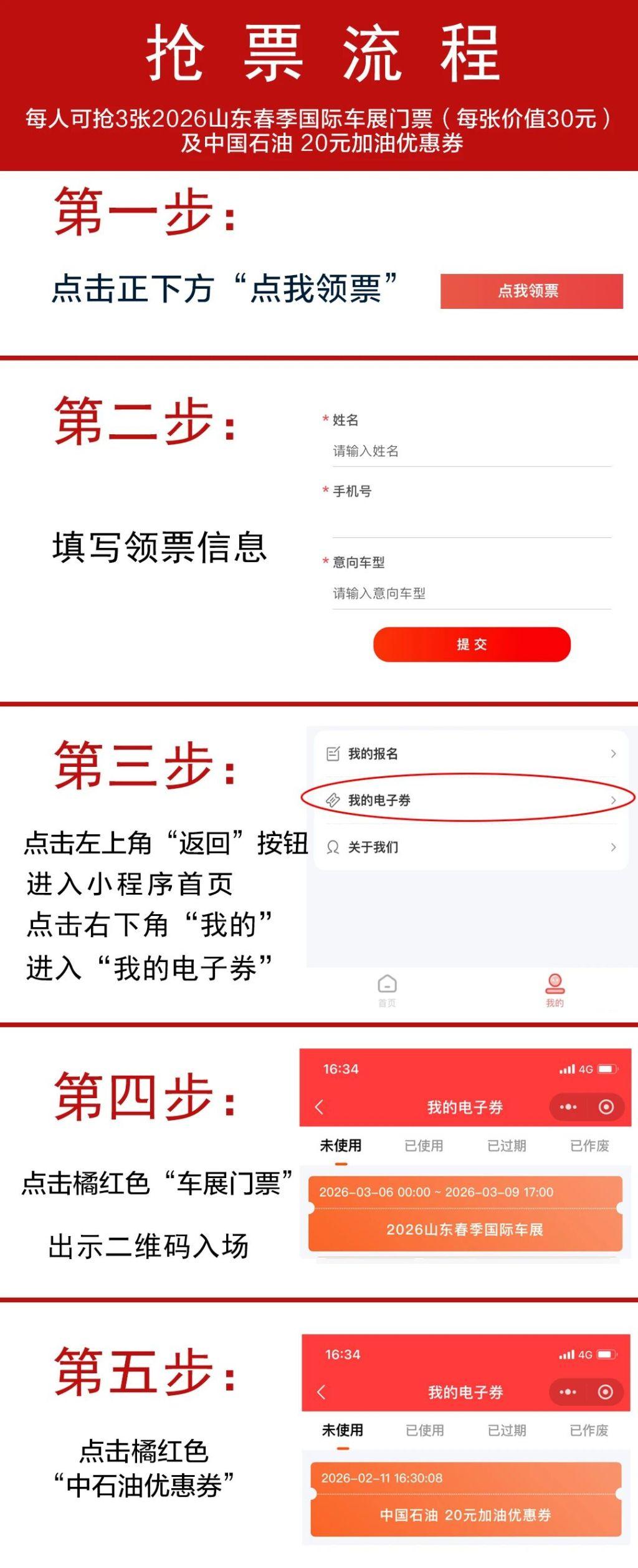 与往年不同的是,今年提交报名后,在“半岛车展”微信小程序“我的电子券”里,还将额外得到中国石油20元加油优惠券。这是组委会联合中石油青岛公司向岛城广大车主送出的重磅福利,每人可领取两张,总计价值40元。加油优惠券领取后30日内有效,当天抢当天就能用,抢到就是赚到!