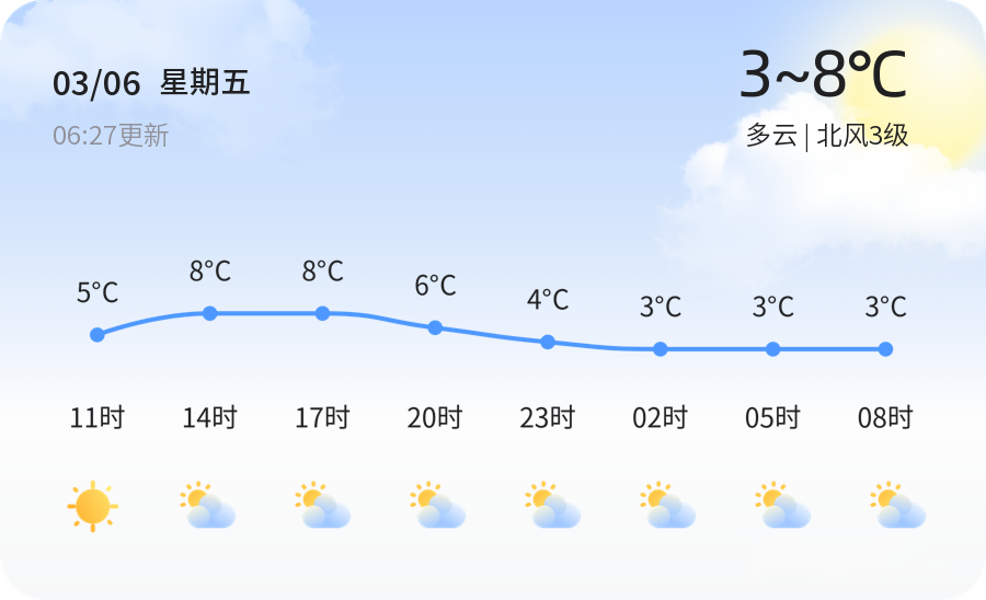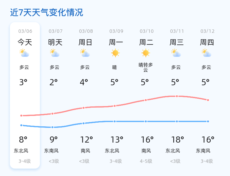 今天是3月6日,星期五,菏泽市迎来多云天气。当前时间为06时27分,气温为2℃,北风3级,空气湿度为78%。今日最高气温预计可达8℃,最低气温为3℃。各区天气情况总体平稳,以多云为主,风力适中,适宜市民外出活动。明天菏泽市天气仍将以多云为主,与今日相比,气温略有上升,最低气温为2℃,最高气温可达9℃。风向转为东南风,风力减弱至<3级,整体天气较为舒适,适合户外活动。未来三天,菏泽市天气趋势平稳,以多云为主,偶有晴天。气温将逐步回升,最高气温可达12℃,最低气温为4℃。市民需注意气温波动,适时增减衣物,预防感冒。此外,未来三天风力较小,空气质量较好,适合户外活动。温馨提示