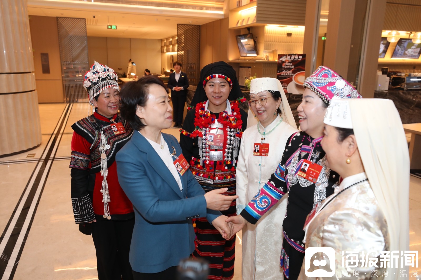 不知是被绚丽的民族服装吸引,还是出于民族宗教事务工作者的本能,曹金萍快步向前,笑着向走在前面的几位女代表发出邀请:“代表们,我们一起合张影好吗?”