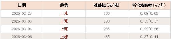 从调价窗口变化情况来看,自2月27日以来,预计上调幅度从每吨100元逐步扩大至485元,涨幅显著增加。与去年同月油价相比,本次调整后价格仍便宜0.19至0.47元/升,但仍需关注后续市场波动。