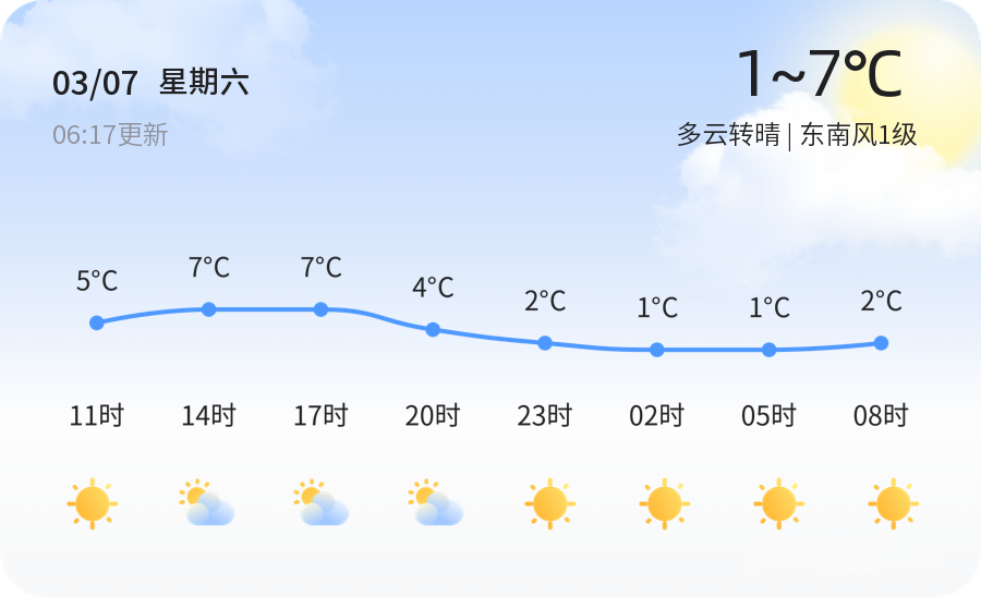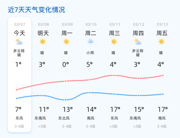 今日是3月7日,星期六,农历正月十九。枣庄市今天天气多云转晴,气温适中,最高气温7℃,最低气温1℃,东南风1级,空气湿度为90%,PM2.5指数为78。各区天气情况一致,均为多云转晴,温度在1℃至7℃之间,风力较小,适合市民户外活动。