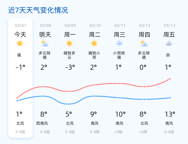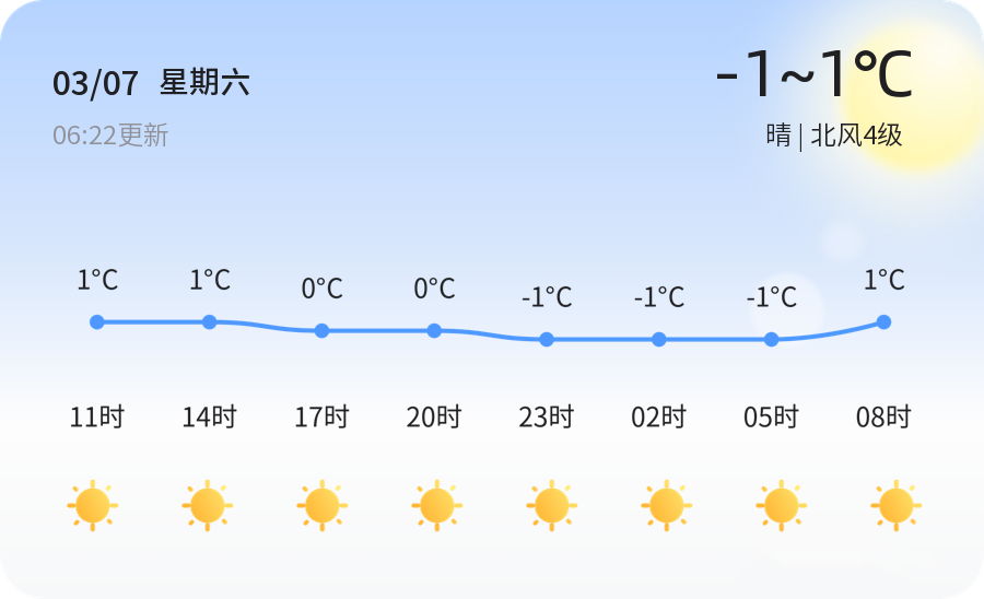 今天是3月7日,星期六,农历正月十九。威海市今天天气晴朗,气温在-1℃到1℃之间,北风4级,空气湿度为36%,PM2.5指数为25。各区天气情况一致,均为晴朗天气。