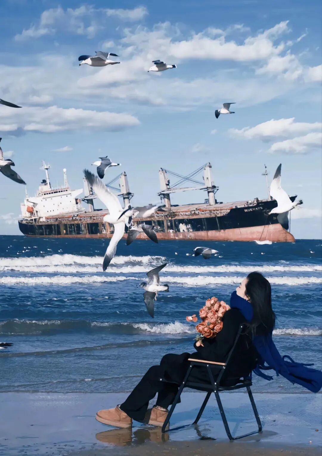 当阳光洒在海面上,巨大的船身与蓝天碧海、嶙峋礁石同框,随手一拍就是一张可以原图直出的明信片。那种工业文明与自然景观的碰撞,既震撼又和谐。