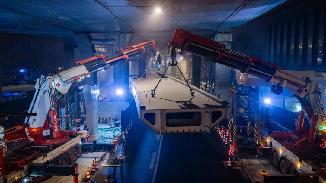 3月4日23时,北园大街相关路段准时实施交通封闭管制,施工人员已提前完成精密测量放线及临时支架体系安装,为钢箱梁精准调标、就位提供可靠支撑;在指挥员、起重工、测量员紧密配合下,梁段平稳穿越高架桥下与公交电缆间的有限空间。