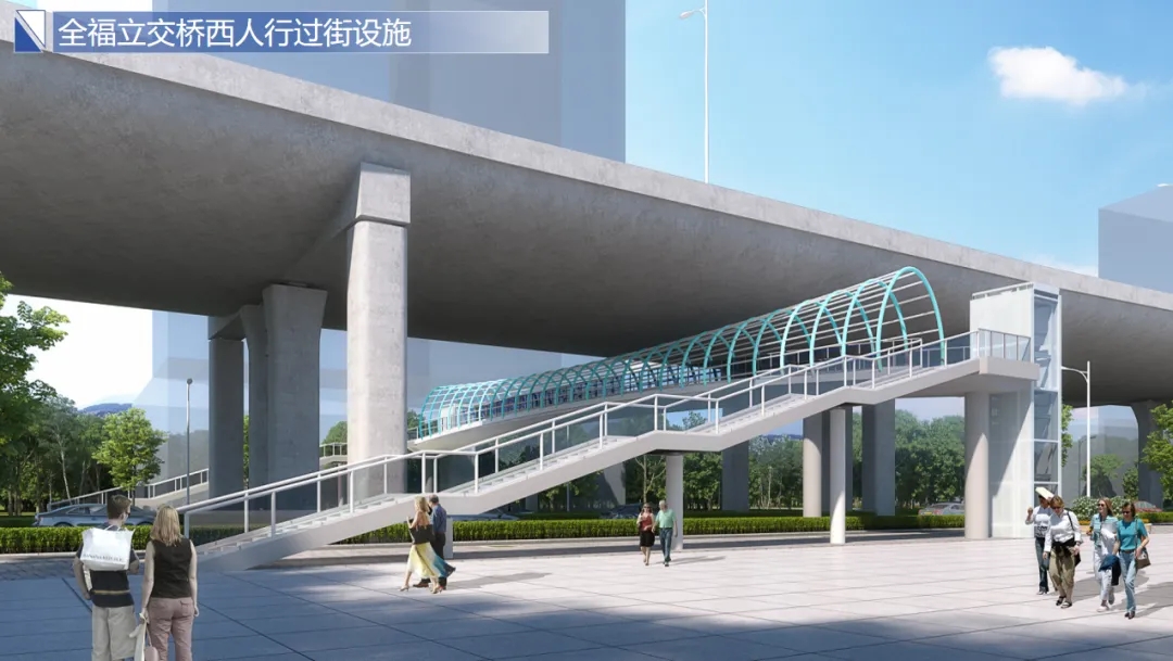 据悉,全福立交桥西侧人行天桥全长45.25米,桥面宽4.5米,采用单箱三室钢箱梁结构,南北两侧各配置1条梯道和1座垂直电梯。项目建成后,将有效实现北园大街主干道人车分流,消除行人横穿马路的安全隐患,显著提升片区居民的过街便捷性与安全性。