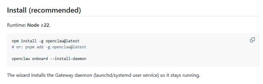 OpenClaw项目官方安装指南显示。图片来源:OpenClaw的Github
