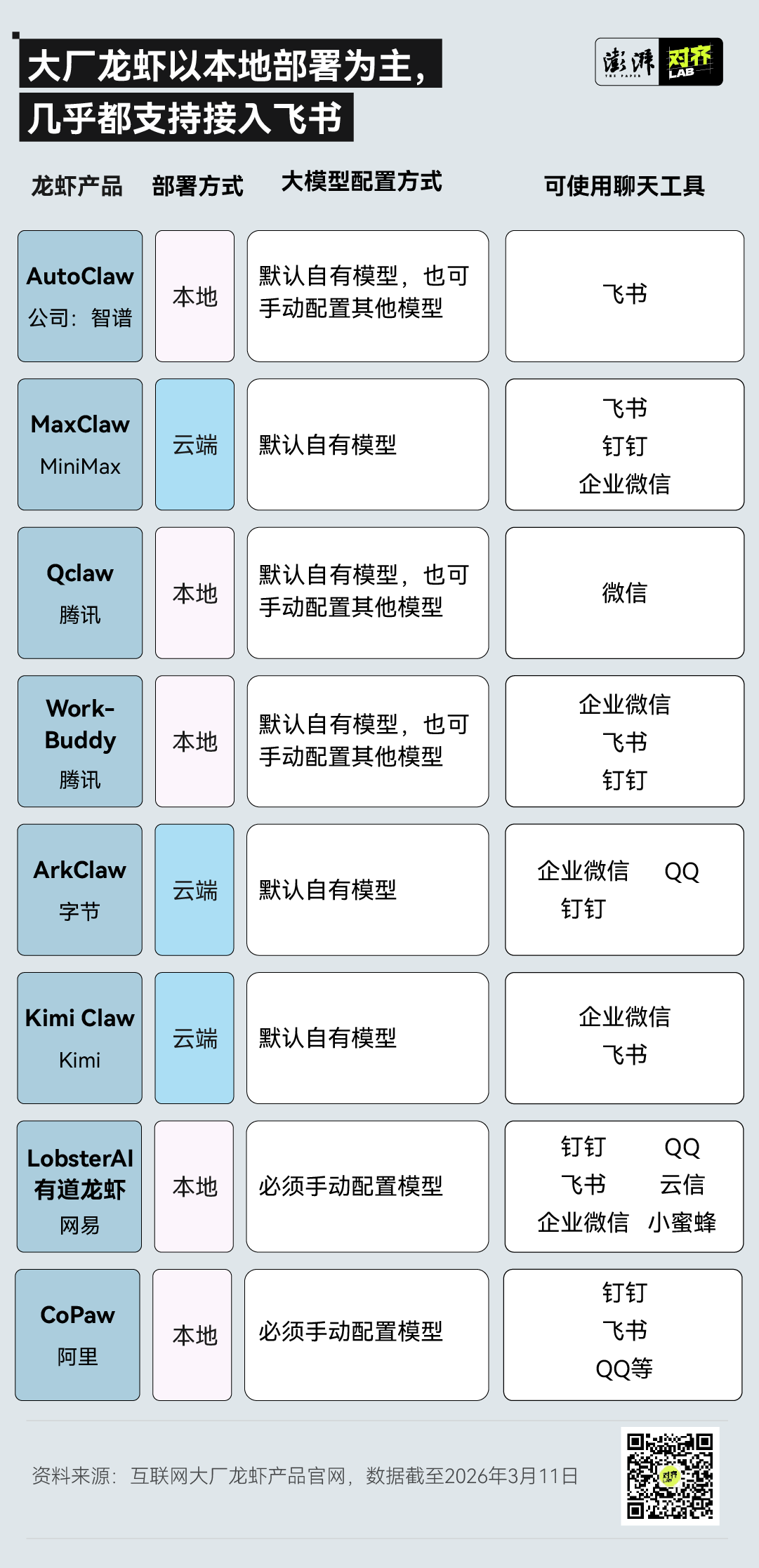 这也是很多大厂在做“龙虾”产品时第一个解决的痛点。在澎湃对齐Lab实测的8种“龙虾”产品中,不论是部署在本地还是云端,均未出现因为环境错误导致无法运行的情况。配置环境这一环节的操作,被大厂版“龙虾”大大简化。