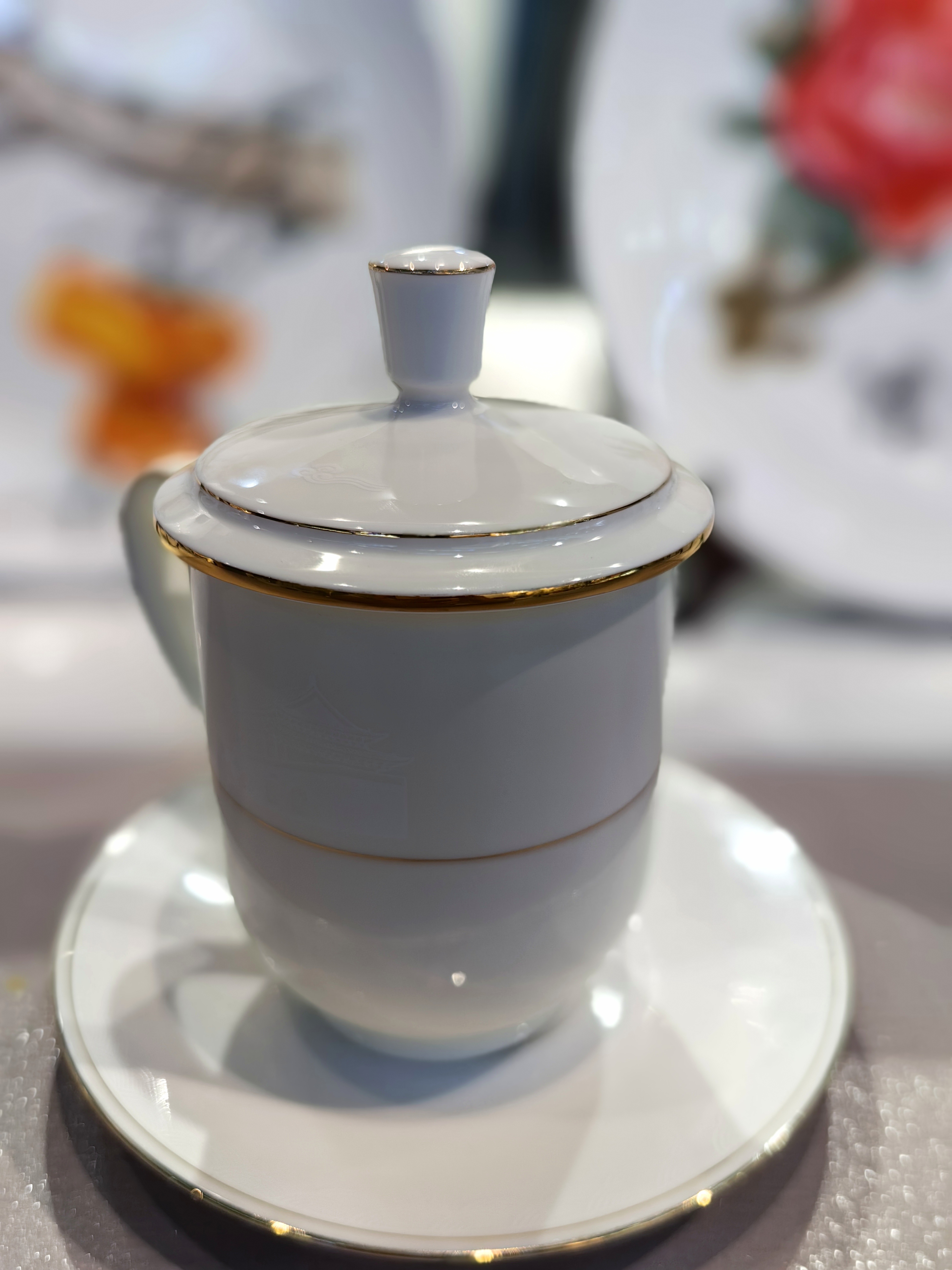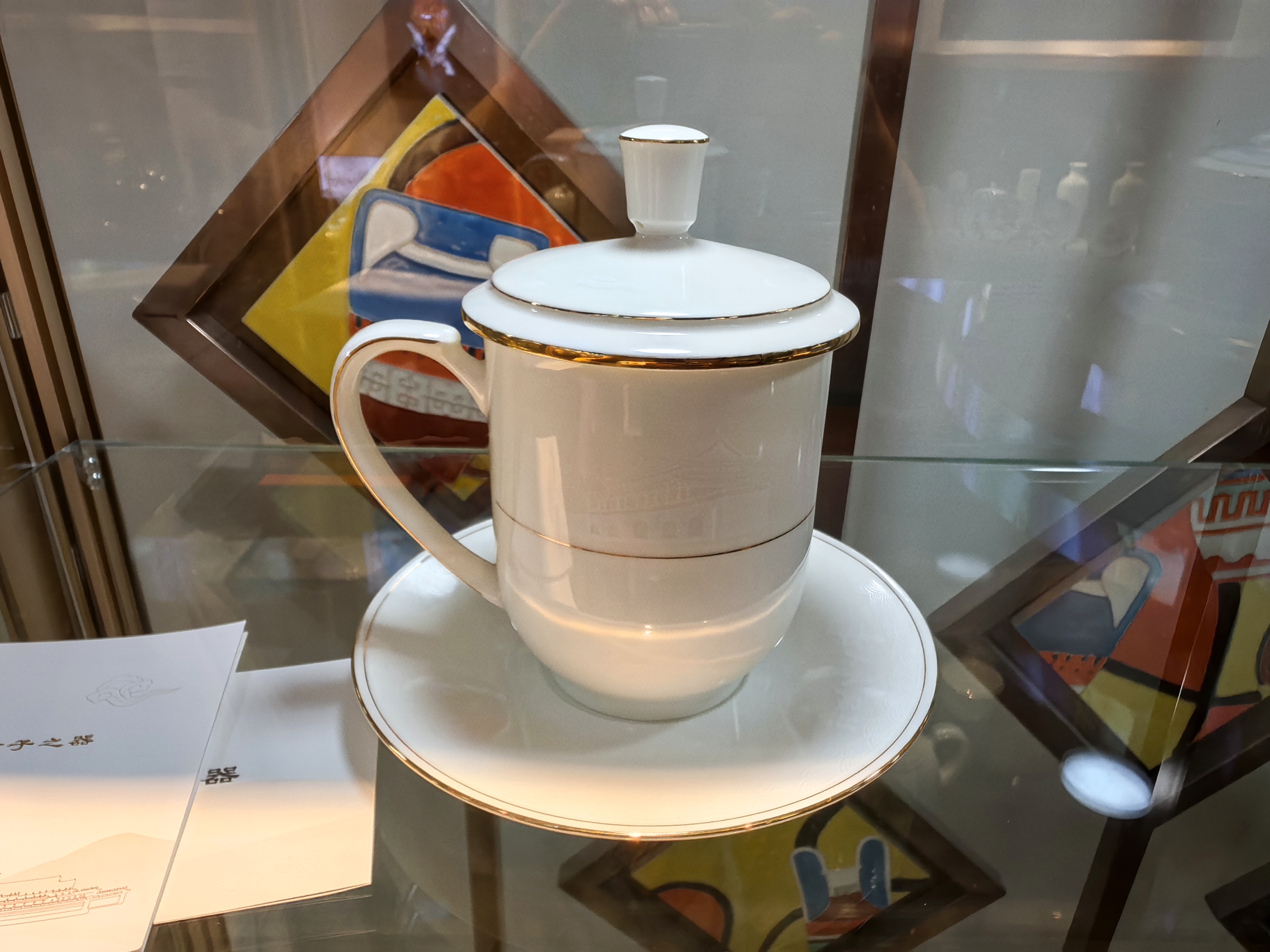 记者在新开馆的“淄博馆”,近距离上手体验了一把“国窑风采”。这是一只有盖瓷杯,有托盘,其外观简洁、大方,又透着一股雍容、华美的气度;颜色洁白偏暖,呈现出象牙一般的光泽,亮而不光;瓷器的手感软糯,感觉非常亲人,透出一股羊脂白玉般的“油性”;细察细节处理更是被惊到了,杯子腰部、托盘外沿内侧各有一圈烫金细线,细如眉毛,据称竟然是纯手工一笔画出的!如此一只杯子竟找不出一点瑕疵,实在是令人叹为观止。