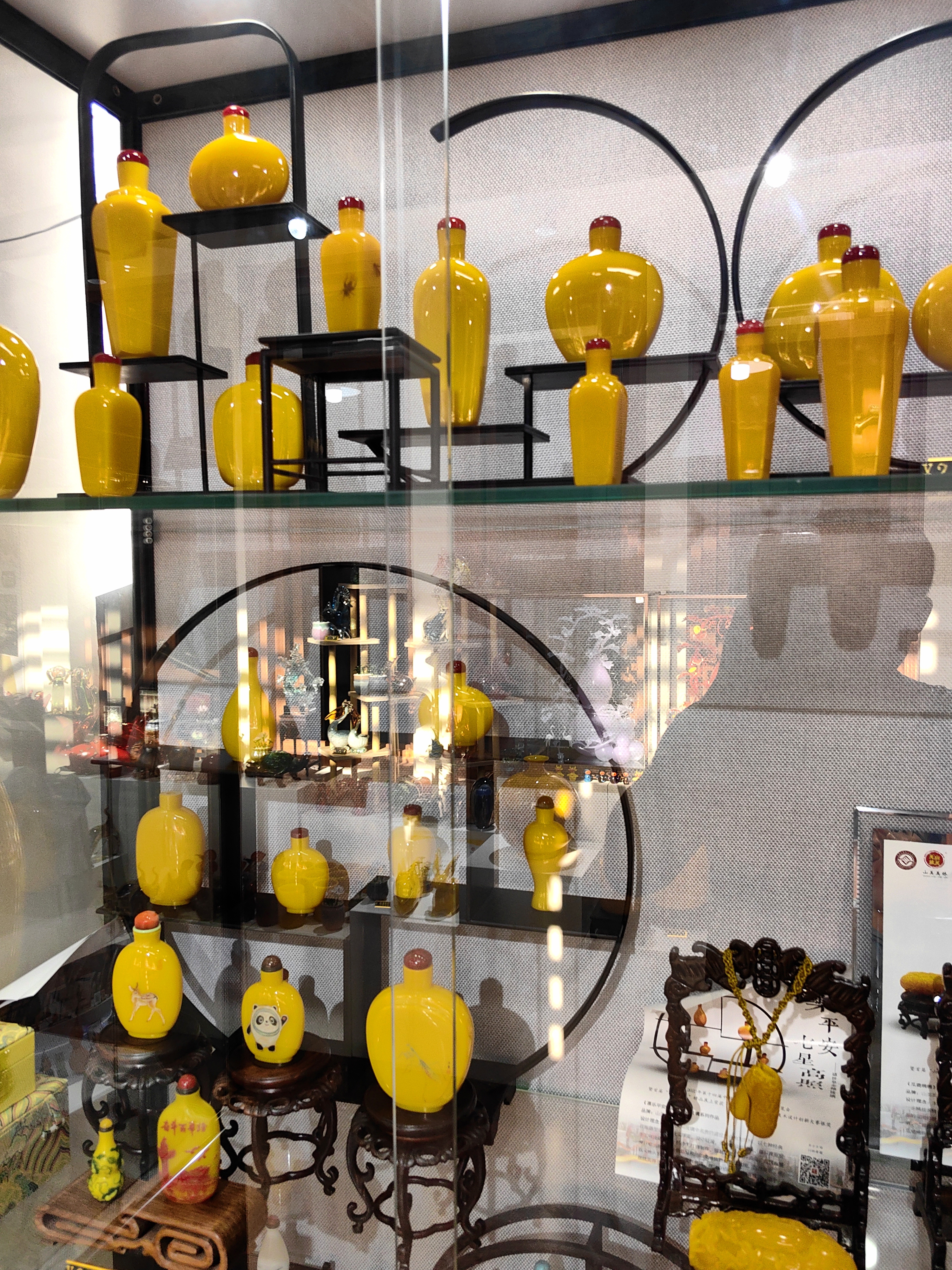 重装提升的“淄博馆”位于二楼偏北中心位置,透过玻璃窗就展示其特色。目测以脍炙人口的淄博手造“灵魂三件套”陶瓷、琉璃、丝绸为主,与山东其他地方展馆明显不同。