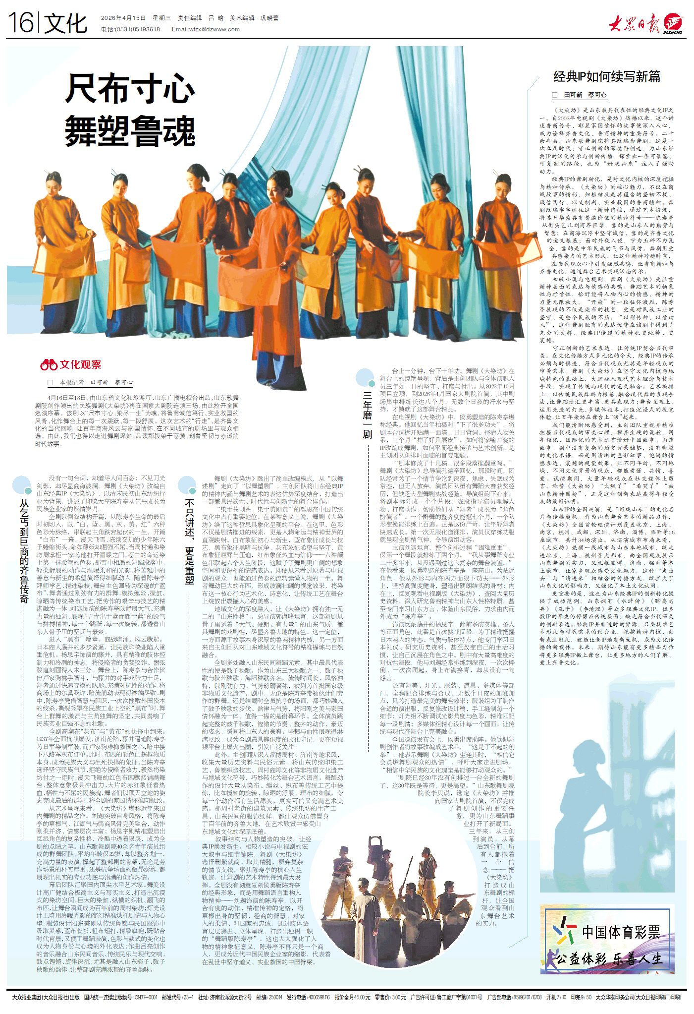 4月16日至18日,由山东省文化和旅游厅、山东广播电视台出品,山东歌舞剧院创作演出的民族舞剧《大染坊》将在国家大剧院连演三场,由此拉开全国巡演序幕。该剧以“尺布寸心,染尽一生”为魂,将鲁商诚信笃行、实业救国的风骨,化作舞台上的每一次跳跃、每一段舒展。这次艺术的“行走”,是齐鲁文化的当代回响,让百年商海风云与家国情怀,在不同城市的剧场里与观众相遇。由此,我们也得以走进舞剧深处,品读那段染于苍黄、刻着坚韧与赤诚的时代故事。