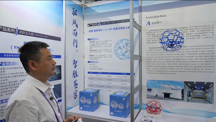 山东驭风智能科技有限公司的展位前,一款带防护罩的小型无人机成为客商咨询的焦点,这是企业带来的无人机足球产品。据山东驭风智能科技市场总监李夫标介绍,该产品在国内为教育部白名单赛事专用设备,可用于青少年赛事,相关赛事已列入第十五届全运会群众性比赛项目;在国际市场,该产品可作为青少年教学与娱乐用品。
