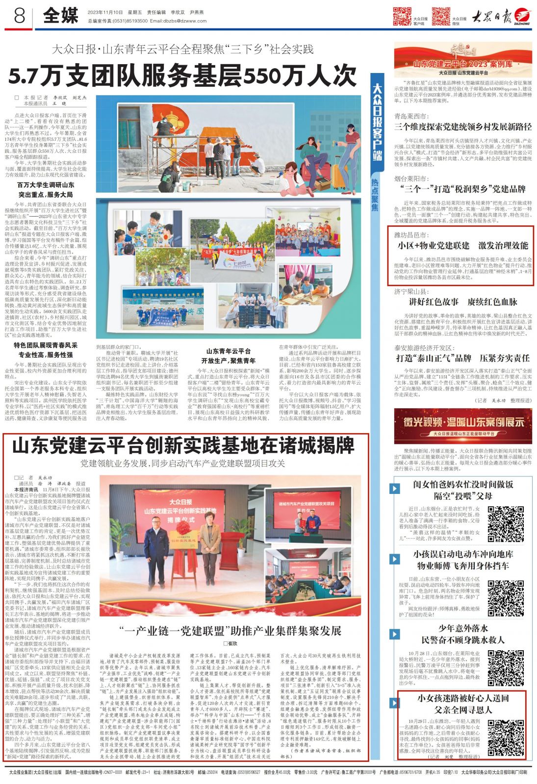△11月8日下午,大众日报山东党建云平台创新实践基地揭牌暨诸城市汽车产业党建联盟攻关项目签约仪式在诸城举行。这是山东党建云平台全省第八个创新实践基地。