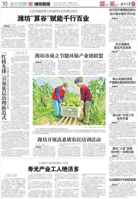 本周《大众日报》潍坊新闻版还刊发了《潍坊滨海区经济运行亮点频现》《做强产业链 做强产业网》《潍坊市成立节能环保产业链联盟》《“红榜先锋”引领基层治理新范式》《潍坊开展高素质农民培训活动》等重点稿件。