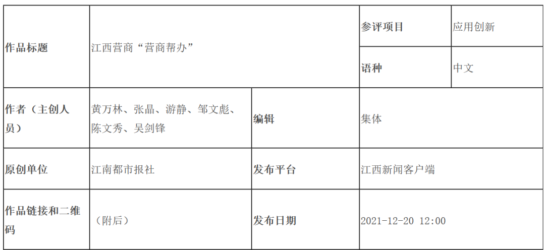 这一应用作品是江西日报社贯彻落实习近平总书记关于优化营商环境重要论述和深度推进媒体融合发展重要论述的生动实践,在推进营商环境优化和促进经济社会发展方面具有创新性和示范性效果,闯出了一条传统媒体深度融合和加快转型发展的探索路径。