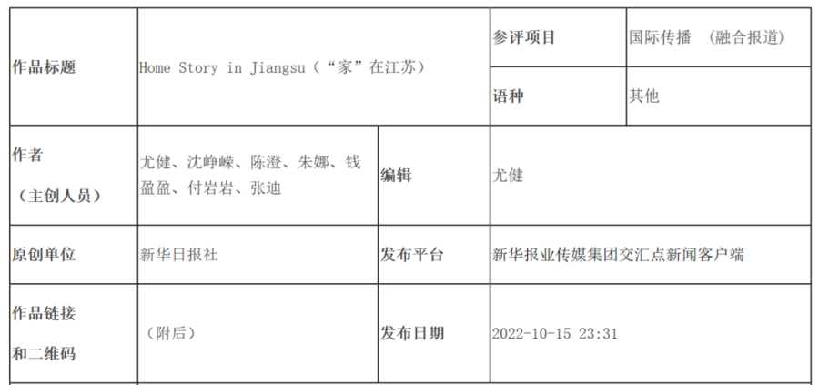 在第33届中国新闻奖评选中,新华日报社国际传播融合报道作品《Home Story in Jiangsu(“家”在江苏)》获国际传播类一等奖,这是本届6件获此殊荣的作品中唯一一件地方媒体作品。此前,该作品入选中国记协“党的二十大报道融创精品十大案例(地方媒体)”,也是全国范围内地方媒体国际传播唯一入选作品。至此,新华日报社实现了五年内三次荣获中国新闻奖国际传播奖的不俗收获。
