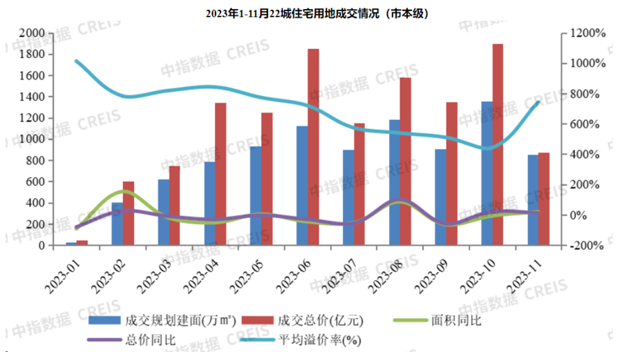 另据中指研究院最新发布的《中国300城市土地市场交易情报》,今年前11月,全国300城推出规划建面同比降20%,成交规划建面同比降27%,推出楼面均价同比涨1.8%,成交楼面均价同比涨7.5%,土地出让金同比降21%。