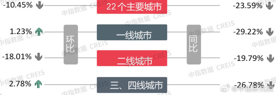 中指研究院监测数据显示,11月楼市成交量整体同环比均下降。其中,一线城市成交面积环比小幅上涨1.23%,同比下23.59%;其中上海以12.31%领涨,北京下跌18.86%。二线代表城市成交面积同环比分别下降19.79%和18.01%,其中武汉跌幅显著,达58.71%。四线代表城市成交面积环比上涨2.78%,同比跌幅为26.78%。