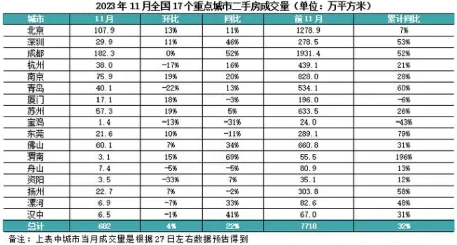 克而瑞数据显示,11月17个重点城市二手房成交面积预计为682万平方米,环比增长4%,同比增长22%。前11月,二手房累计成交7718万平方米,累计同比增长32%。