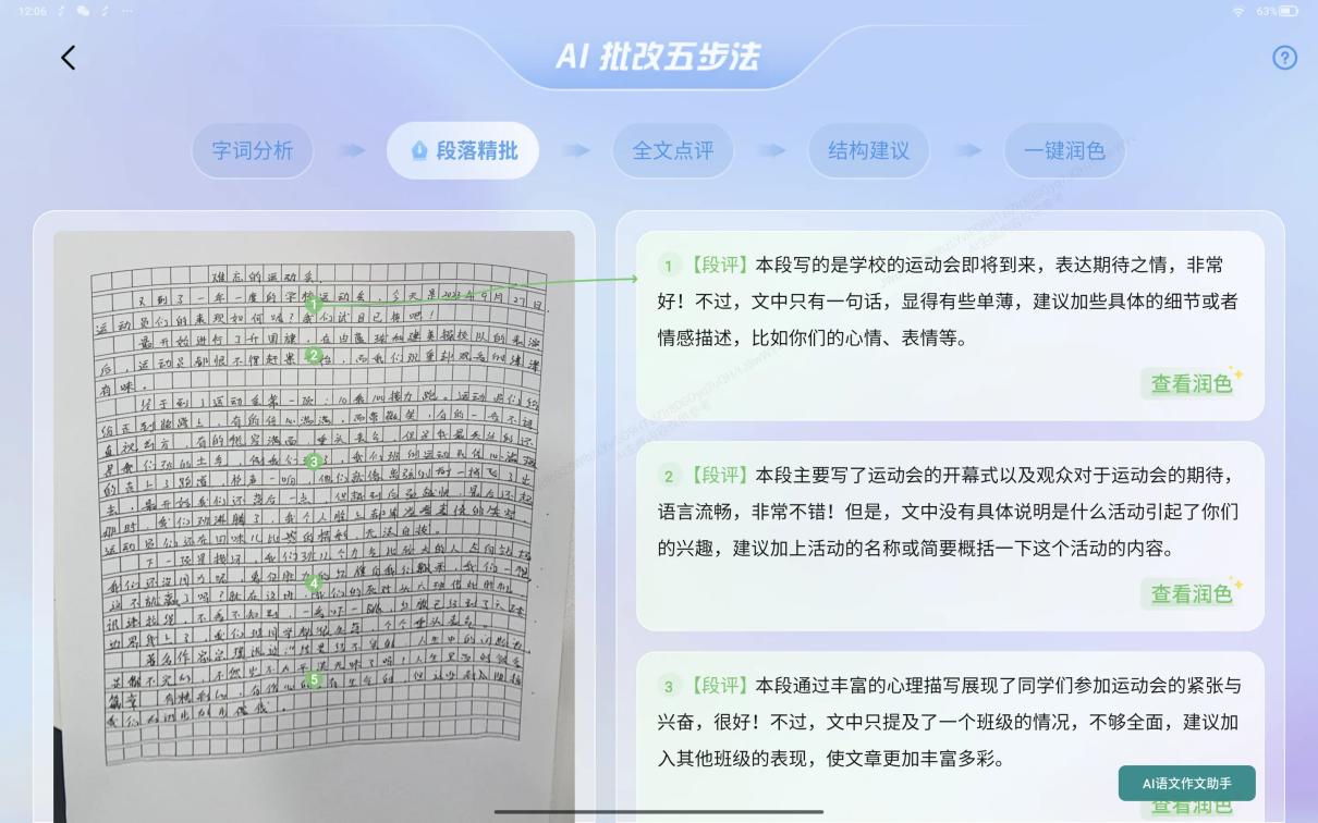 以中文作文批改为例,学而思让大模型专项学习了教研老师提炼的“字、词、句、段、篇”五步优化法,可以实现语文作文的一键润色。