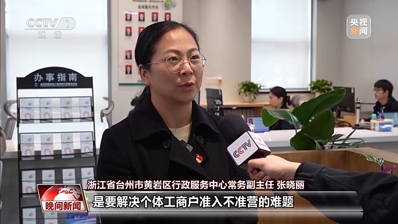 浙江省台州市黄岩区行政服务中心常务副主任 张晓丽:我们最核心的工作是要解决个体工商户准入不准营的难题,把事后的监管前置到了事前的服务。自从服务推行以来,市场主体活跃度达到了93.26%,确保了市场主体能够进一步可持续发展。