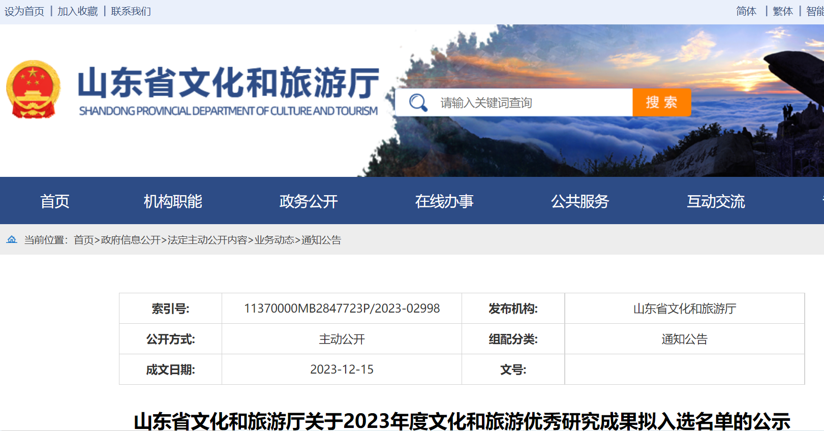 山东省文化和旅游厅关于2023年度文化和旅游优秀研究成果拟入选名单的公示