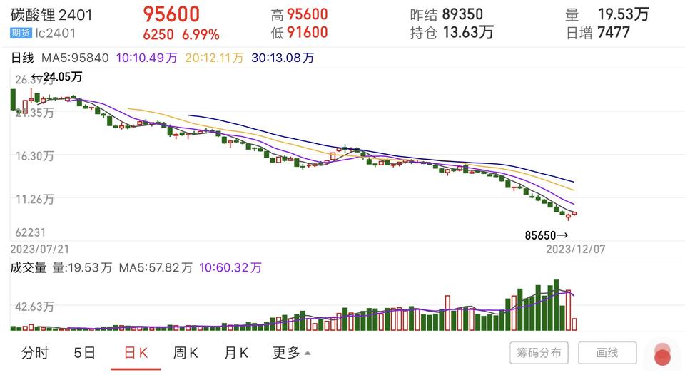 截至12月7日收盘,碳酸锂2401报9.56万元/吨,涨幅6.99%。