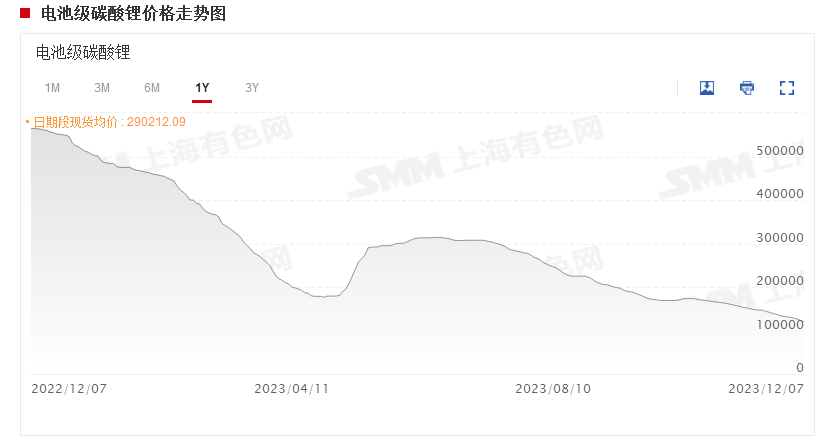 工业级碳酸锂价格走势与电池级碳酸锂基本契合,高价曾达54.2万元/吨,12月7日报10.25万元/吨-11.15万元/吨,均价10.7万元/吨,较前一日跌去2500元,近一个月跌幅近29%,年内跌幅超77%。