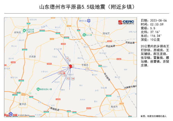 8月6日2时33分,山东德州市平原县(北纬37.16度,东经116.34度)发生5.5级地震,震源深度10公里。