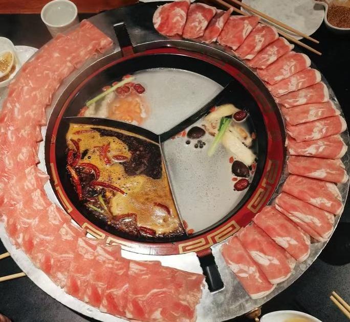 从新鲜牦牛肉上片出的肉片,肉纹清晰,红白分明,片片伸展开如蒲扇大小,夹起一片放入火锅中,满口鲜香,回味无穷。
