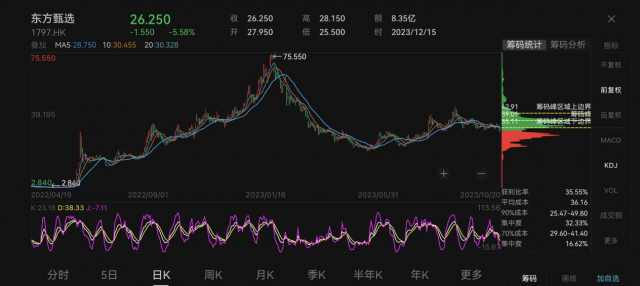 因为近几日舆情发酵,股价4天跌幅累计超25%,截至12月15日收盘,东方甄选(HK1797)报26.25港元。