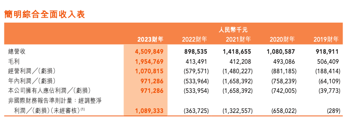 财报显示,截至今年5月31日,东方甄选2023财年实现总营收45.10亿元(人民币,除特殊说明,下同),同比增幅高达651%;实现净利润9.71亿元,实现扭亏为盈。而在2019财年至2022财年,东方甄选净利润分别是-0.4亿元、-7.42亿元、-16.58亿元、-5.34亿元。
