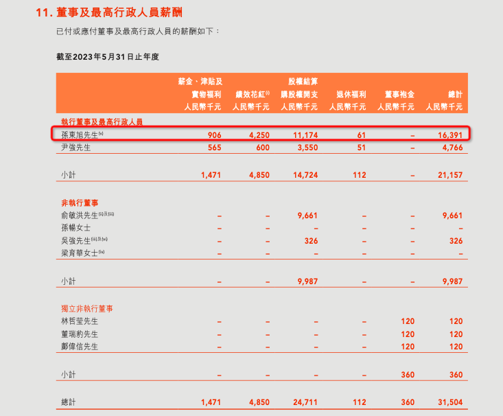 2023财年,孙东旭所得薪资、绩效、股权等合计1639.1万元。同期,俞敏洪作为董事会主席,年薪为966万元;尹强作为执行董事,年薪为476.6万元。